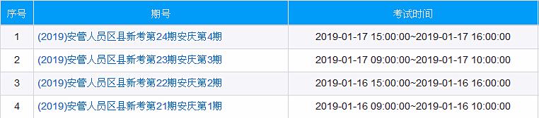 为贯彻落实《关于进一步加强建筑施工企业安管人员和特种作业人员考核管理工作的通知》(建质函〔2017〕989号)文件精神,使用全省统一的“安徽省建筑施工企业安管人员、特种作业人员考试系统”进行计算机考试要求,现将2019年元月份安庆市安管人员计算机考试准考证号码及考试场次安排公布如下,详见附件: