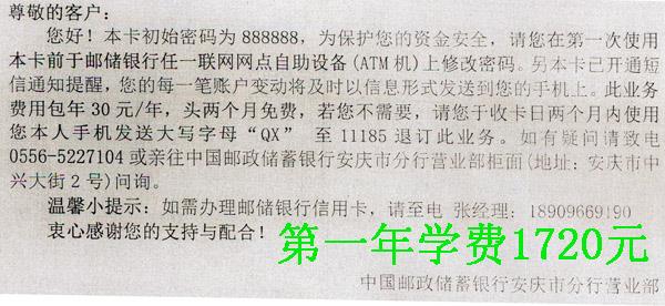 现将安徽建筑大学2014级学员缴费卡号码和缴费卡说明公布如下,请查阅缴费,第一学年学费为1720元。没有提交身份证的请赶快提交办卡。谢谢!
