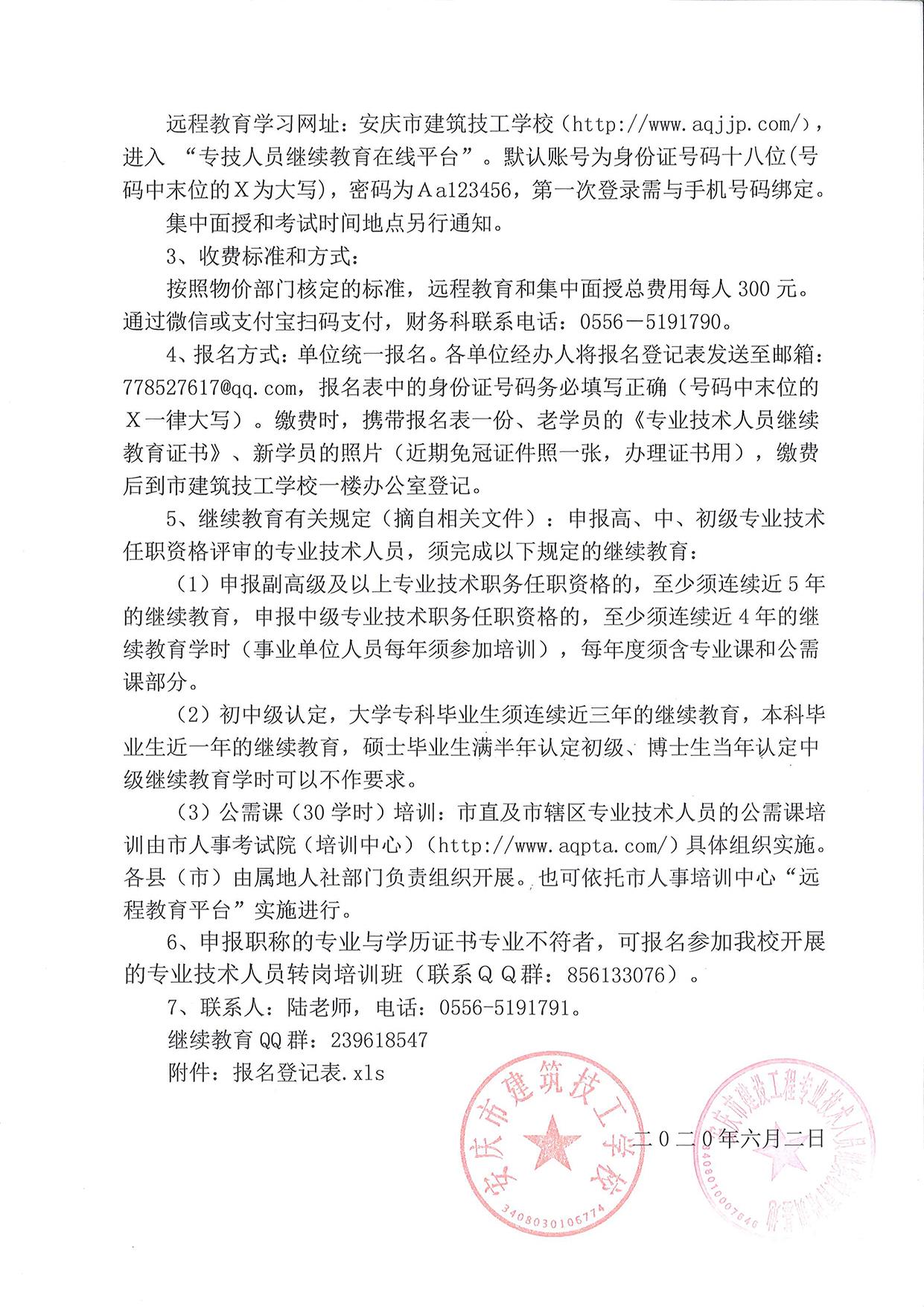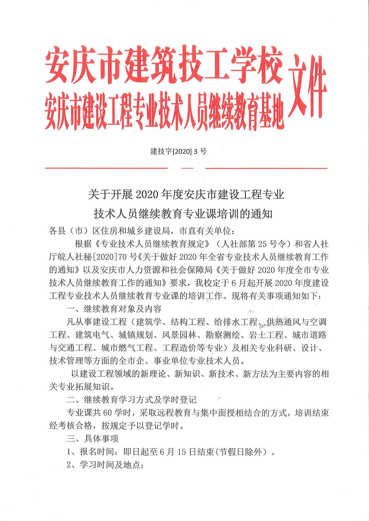 根据《专业技术人员继续教育规定》(人社部第25号令)和省人社厅皖人社秘[2020]70号《关于做好2020年全省专业技术人员继续教育工作的通知》以及安庆市人力资源和社会保障局《关于做好2020年度全市专业技术人员继续教育工作的通知》要求,我校定于6月起开展2020年度建设工程专业技术人员继续教育专业课的培训工作。现将有关事项通知如下: