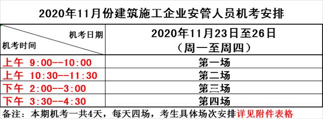 为贯彻落实《关于进一步加强建筑施工企业安管人员和特种作业人员考核管理工作的通知》(建质函〔2017〕989号)文件精神,使用全省统一的“安徽省建筑施工企业安管人员、特种作业人员考试系统”进行计算机考试要求,现将2020年11月份安庆市建筑施工企业安管人员计算机考试准考证号码及考试场次安排公布如下,详见附件:
