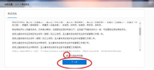 点击“返回首页”,在“考试报名”模块点击“进入”,同意考试须知后点击“下一步”。