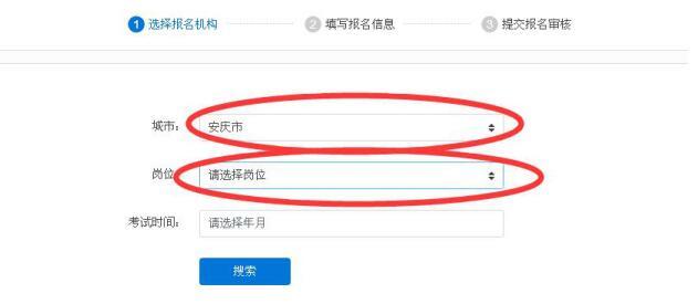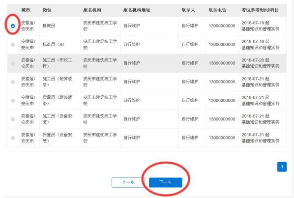 “选择报名机构”的城市选择安庆市,“岗位”选择学员申报的岗位,点击“查询”,选择安庆市建筑技工学校的考试后点击“下一步”